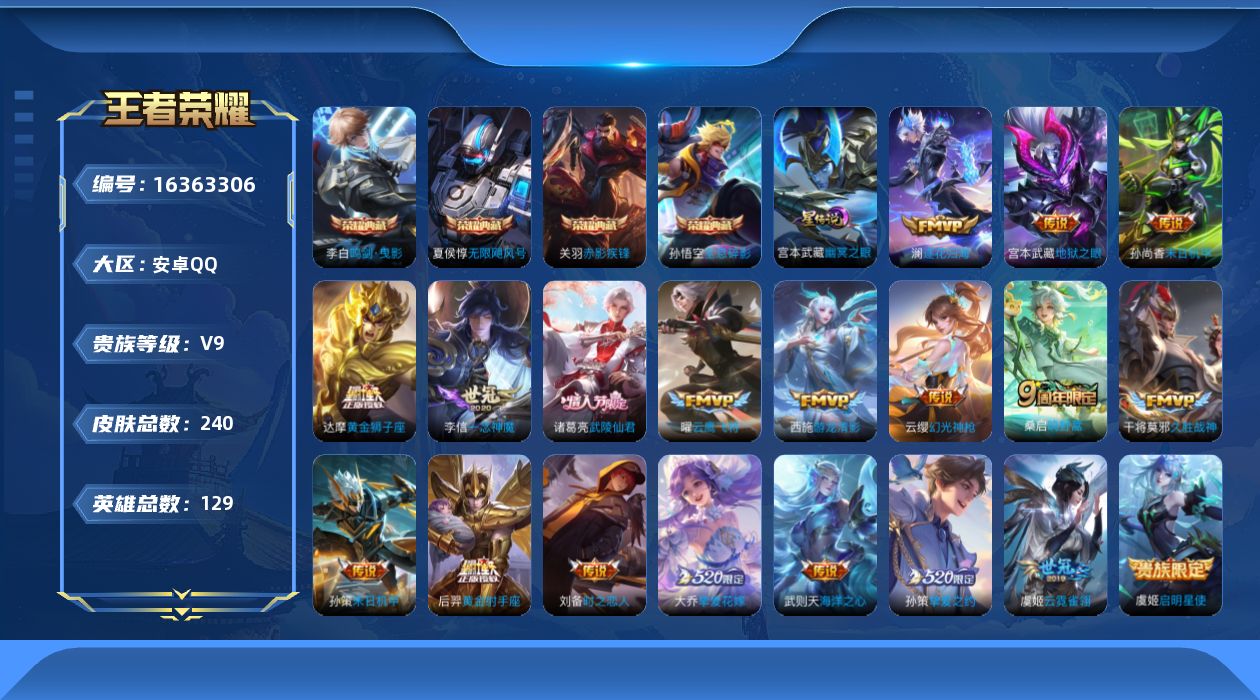 [16363306]可二次【特价出售/店主推荐】:安卓Q-V9-最强王者段位-129英雄-240皮肤-4典藏皮肤-1典藏英雄-1星元-21传说-64史诗