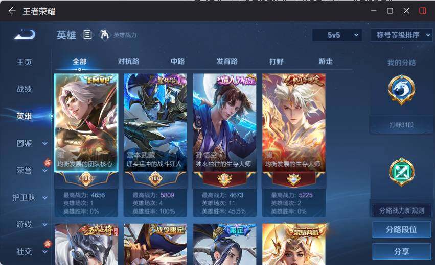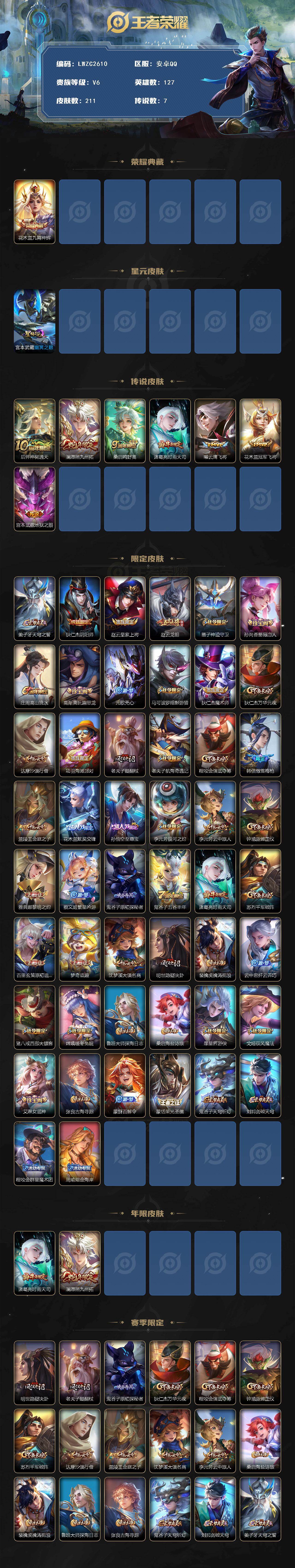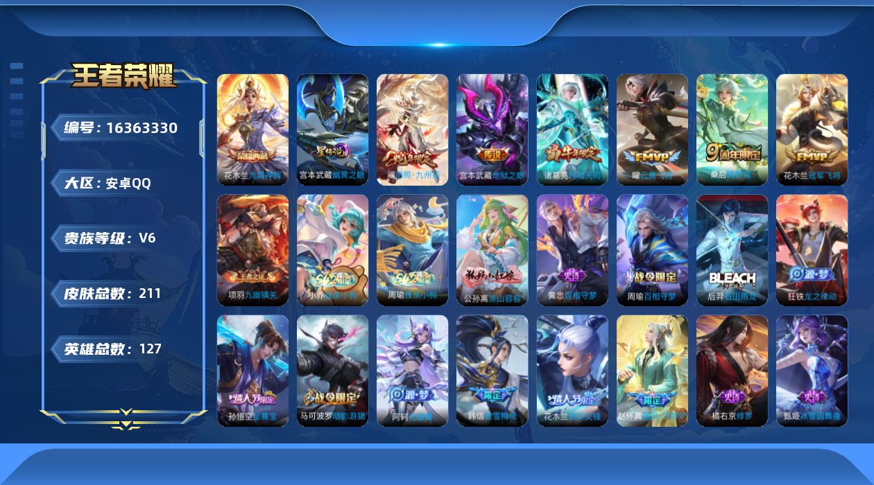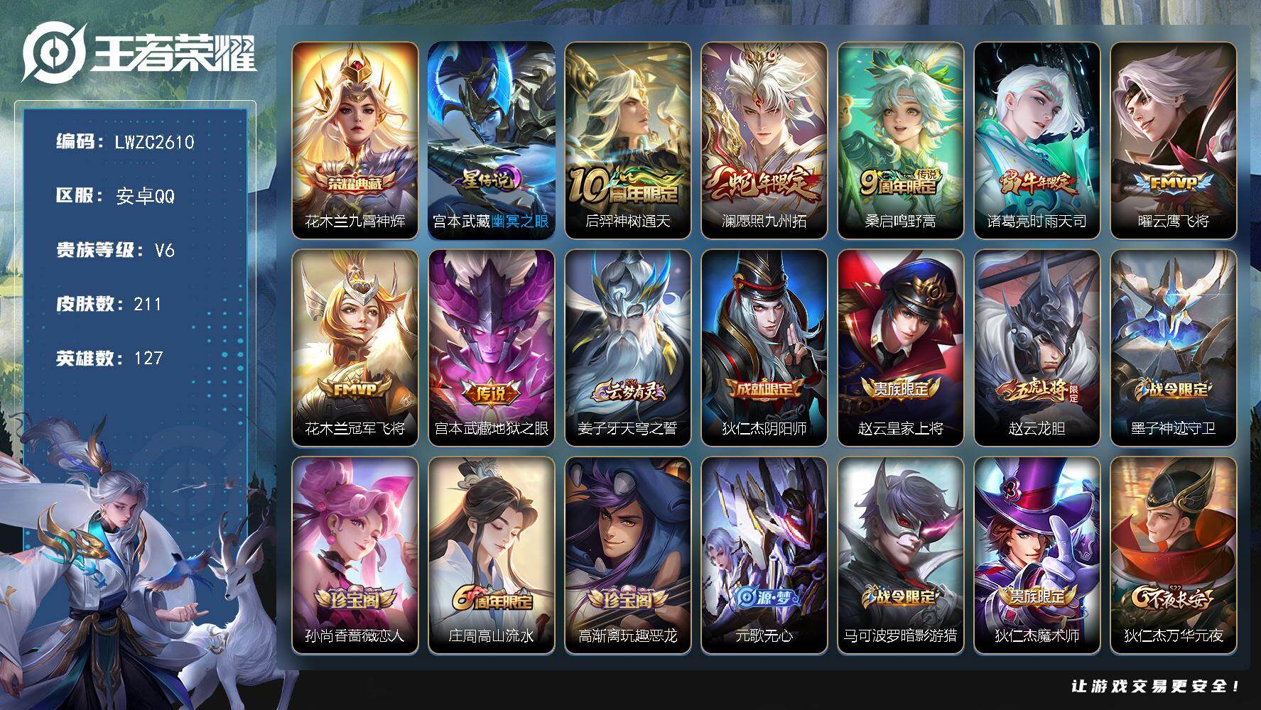 [16363330]【特价出售/店主推荐/31段打野】:安卓Q-V6-至尊星耀I段位-127英雄-211皮肤-1典藏皮肤-1星元-7传说-61史诗