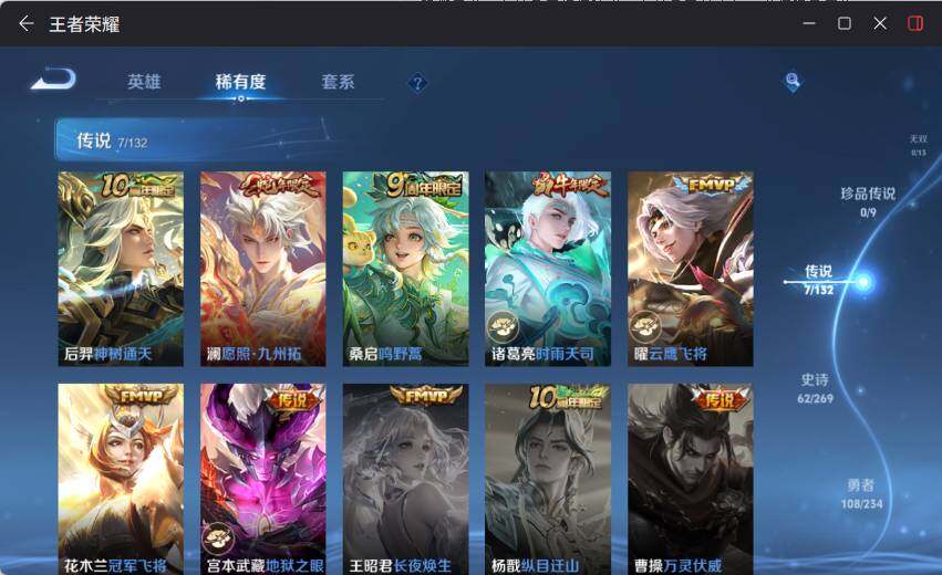 【传说皮肤】:后羿神树通天,澜愿照九州拓,桑启鸣野蒿,诸葛亮时雨天司,曜云鹰飞将,花木兰冠军飞将,宫本武藏地狱之眼