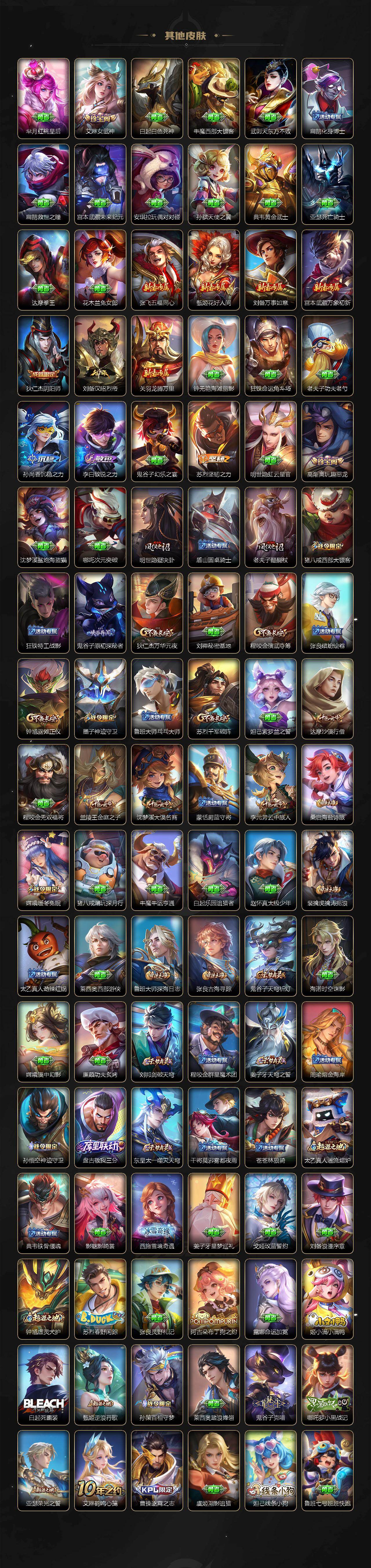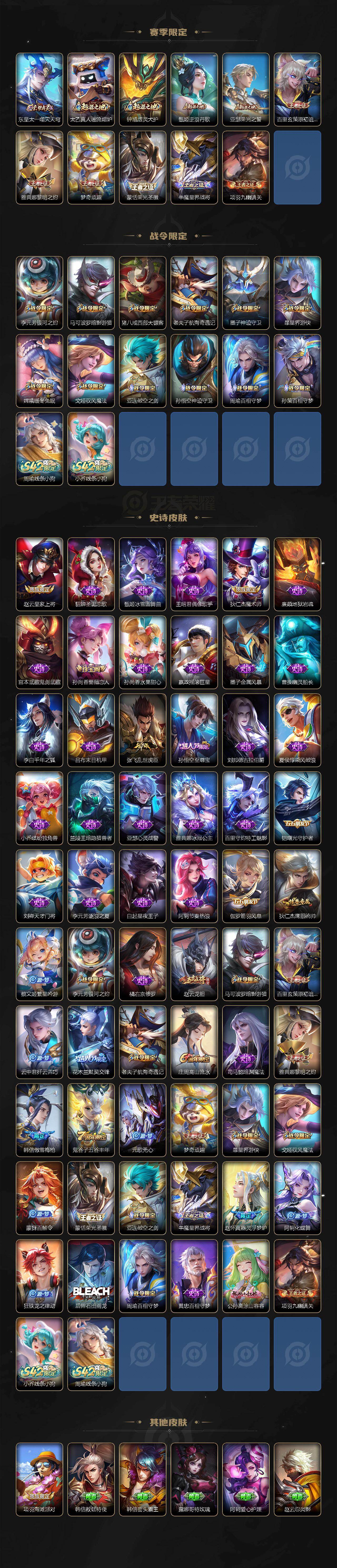 【限定皮肤】:姜子牙天穹之誓,狄仁杰阴阳师,赵云皇家上将,赵云龙胆,墨子神迹守卫,孙尚香蔷薇恋人,庄周高山流水,高渐离玩趣恶龙,元歌无心,马可波罗暗影游猎,狄仁杰魔术师,狄仁杰万华元夜,达摩沙漠行僧,项羽海滩派对,老夫子醍醐杖,老夫子航海奇遇记,程咬金演武夺筹,韩信傲雪梅枪,兰陵王金庭之子,花木兰默契交锋,孙悟空至尊宝,李元芳银河之约,李元芳云中旅人,钟馗驱傩正仪,雅典娜黎明之约,蔡文姬繁星吟游,鬼谷子原初探秘者,鬼谷子五谷丰年,诸葛亮时雨天司,苏烈千军破阵,百里玄策原初追逐者,梦奇顽趣,沈梦溪大漠名商,明世隐疑决卦,裴擒虎擒涛扼浪,云中君纤云弄巧,猪八戒西部大镖客,嫦娥暖冬兔眠,鲁班大师探海日志,桑启海盐诗旅,暃星界游侠,戈娅驭风魔法,艾琳女武神,张良古海寻踪,蒙犽百解令,蒙恬荣光圣徽,鬼谷子天穹祈灯,刘邦剑破天穹,程咬金群星魔术团,周瑜熔金海岸
