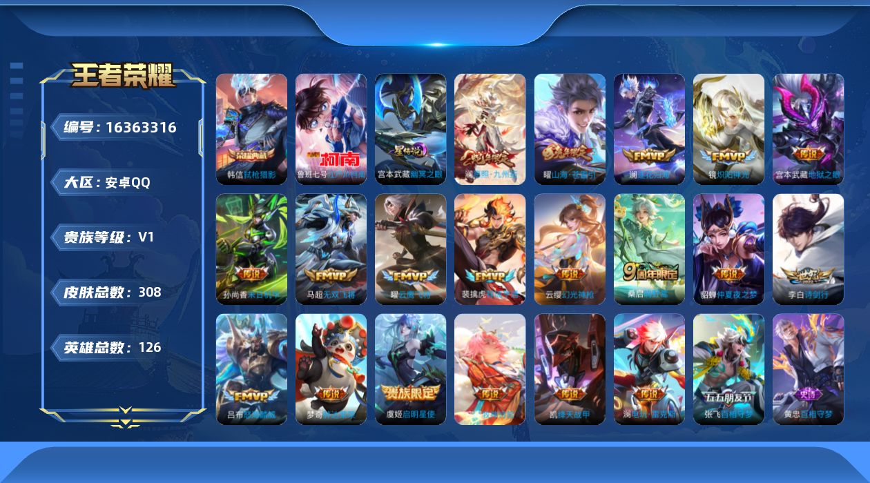 [16363316]可二次【特价出售/店主推荐】打野33段,安卓Q-V1-至尊星耀III段位-126英雄-308皮肤-1典藏皮肤-1珍品传说-1星传说-21传说-95史诗 【英雄全皮】:苍全皮,澜全皮,镜全皮,赵怀真全皮,空空儿全皮,影全皮 【荣耀典藏】:韩信弑枪猎影 【珍品传说】:鲁班七号江户川柯南 【传说皮肤】:后羿神树通天,澜愿照九州拓,云缨幻光神枪,裴擒虎祥瑞亨通,桑启鸣野蒿,庄周牧神诗旅,澜逐花归海,澜电玩雷克斯,张飞百相守梦,曜山海苍雷引,吕布怒海麟威,李白诗剑行,马超无双飞将,铠绛天战甲,镜炽阳神光,虞姬启明星使,曜云鹰飞将,梦奇胖达荣荣,貂蝉仲夏夜之梦,孙尚香末日机甲,宫本武藏地狱之眼 【限定皮肤】:蔡文姬夏日便利店,虞姬夏日便利店,姜子牙天穹之誓,杨戬破阵退雄兵,李白谪仙醉月,狄仁杰阴阳师,赵云皇家上将,高渐离玩趣恶龙,元歌无心,马可波罗暗影游猎,马可波罗山海玄木吟,狄仁杰魔术师,达摩沙漠行僧,项羽海滩派对,关羽百相守梦,韩信傲雪梅枪,兰陵王金庭之子,刘备百相守梦,张飞百相守梦,李元芳匿光侦查者,李元芳云中旅人,虞姬启明星使,钟馗驱傩正仪,哪吒逐梦之翼,雅典娜黎明之约,鬼谷子五谷丰年,苏烈千军破阵,沈梦溪大漠名商,沈梦溪匿光破解者,裴擒虎天狼狩猎者,裴擒虎李小龙,裴擒虎擒涛扼浪,狂铁电玩高手,猪八戒猪悟能,嫦娥暖冬兔眠,曜山海苍雷引,西施玲珑珍味,鲁班大师探海日志,镜匿光追影者,桑启海盐诗旅,暃星界游侠,戈娅驭风魔法,赵怀真鹤归松栖,张良古海寻踪,蒙恬荣光圣徽,鬼谷子天穹祈灯,姬小满妄想食味,沈梦溪龙舞盛年,鲁班七号蔬乡物语,李元芳蔬乡物语,刘邦剑破天穹,程咬金群星魔术团,镜青焰无极,项羽苍威无极,芈月浮光幕影 【年限皮肤】:曜山海苍雷引,马可波罗山海玄木吟,澜愿照九州拓 【赛季限定】:钟馗驱傩正仪,苏烈千军破阵,达摩沙漠行僧,兰陵王金庭之子,沈梦溪大漠名商,李元芳云中旅人,桑启海盐诗旅,裴擒虎擒涛扼浪,鲁班大师探海日志,张良古海寻踪,鬼谷子天穹祈灯,刘邦剑破天穹,姜子牙天穹之誓,东皇太一噬灭天穹,太乙真人谧流熔炉,钟馗虚灵犬护,甄姬逆浪荇歌,雅典娜黎明之约,蒙恬荣光圣徽,牛魔星界战将 【战令限定】:马可波罗暗影游猎,狂铁电玩高手,暃星界游侠,嫦娥暖冬兔眠,戈娅驭风魔法,西施玲珑珍味,鲁班七号蔬乡物语,李元芳蔬乡物语,镜青焰无极,项羽苍威无极,蔡文姬夏日便利店,虞姬