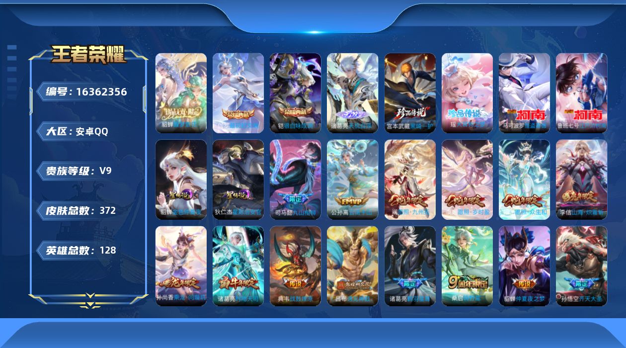 [16362356]【店主推荐捡漏号!可直接换绑】安卓Q-V9-永恒钻石II段位-128英雄-372皮肤-2典藏皮肤-1珍品无双-1无双-4珍品传说-20传说-110史诗-2星元 【英雄全皮】:刘禅全皮,刘邦全皮,钟馗全皮,戈娅全皮,空空儿全皮 【荣耀典藏】:铠银白咏叹调,伽罗最初的交响 【珍品无双】:貂蝉馥梦繁花 【无双皮肤】:诸葛亮天机白泽 【珍品传说】:马可波罗怪盗基德,鲁班七号江户川柯南,瑶大耳狗之梦,宫本武藏黑崎一护 【传说皮肤】:司马懿九山相柳,公孙离云诺千山,妲己愿照众生和,澜愿照九州拓,虞姬愿照岁时盈,桑启鸣野蒿,典韦战鼓燎原,孙尚香乘龙问璇玑,吕布遇见神鼓,东皇太一灼幽烈阳,诸葛亮鹤羽星尊,孙悟空齐天大圣,李信山海炽霜斩,赵云淬星耀世,诸葛亮时雨天司,虞姬启明星使,张良黄金白羊座,虞姬云霓雀翎,貂蝉仲夏夜之梦,狄仁杰超时空战士 【限定皮肤】:白起狰,大乔绒语心约,狄仁杰阴阳师,虞姬凯尔特女王,廉颇寅虎御盾,赵云皇家上将,墨子降魔,嬴政白昼王子,孙尚香蔷薇恋人,鲁班七号狮舞东方,庄周高山流水,阿轲迷踪丽影,钟无艳超时空战士,扁鹊奇幻香踪,白起夜都怪侠,芈月重明,芈月幻夜卜梦,吕布猎兽之王,吕布遇见神鼓,周瑜赤莲之焰,元歌无心,夏侯惇朔风刀,甄姬游园惊梦,甄姬落雪兰心,曹操烛龙,典韦穷奇,典韦蓝屏警告,马可波罗暗影游猎,狄仁杰魔术师,达摩星际陆战队,达摩沙漠行僧,项羽海滩派对,老夫子醍醐杖,老夫子航海奇遇记,程咬金演武夺筹,刘邦夺宝奇兵,王昭君凤凰于飞,王昭君午后时光,兰陵王驯魔猎人,兰陵王金庭之子,孙悟空美猴王,孙悟空齐天大圣,牛魔御旌,后羿如梦令,后羿圣弓游侠,张飞虎魄,李元芳匿光侦查者,李元芳云中旅人,虞姬启明星使,钟馗神迹守卫,钟馗驱傩正仪,杨玉环遇见飞天,杨戬潮玩骑兵,女娲朔望之晖,干将莫邪真爱魔法,雅典娜单词大作战,蔡文姬繁星吟游,鬼谷子原初探秘者,鬼谷子五谷丰年,诸葛亮时雨天司,诸葛亮鹤羽星尊,黄忠火炮绅士,铠青龙志,苏烈千军破阵,百里玄策原初追逐者,弈星混沌棋,沈梦溪星空之诺,沈梦溪大漠名商,明世隐疑决卦,明世隐吟游魔法,裴擒虎李小龙,裴擒虎擒涛扼浪,狂铁御狮,狂铁电玩高手,米莱狄御霄,云中君纤云弄巧,李信山海炽霜斩,伽罗天狼溯光者,盾山御銮,嫦娥拒霜思,嫦娥暖冬兔眠,西施玲珑珍味,蒙犽狂想玩偶喵,鲁班大师探海日志,桑启海盐诗旅,暃星界游侠,戈娅驭风魔法