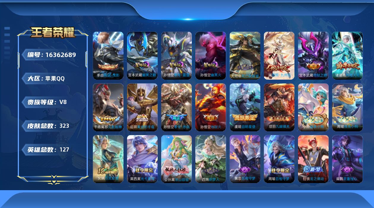 [16362689]【店主推荐捡漏号!可直接换绑】苹果Q-V8-最强王者段位-127英雄-323皮肤-1典藏皮肤-9传说-101史诗-3星元