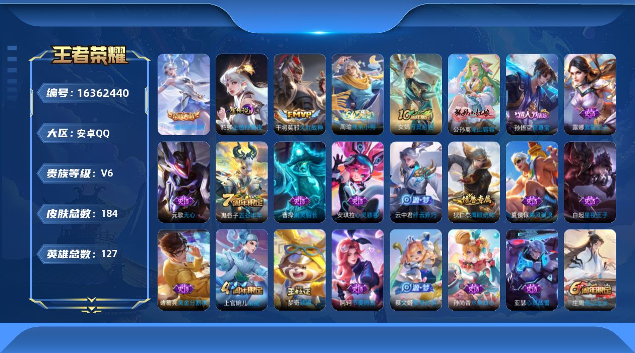 [16362440]【特价急出/详情看图】安卓Q-V6-永恒钻石I段位-127英雄-184皮肤-1典藏皮肤-1星元-2传说-37史诗