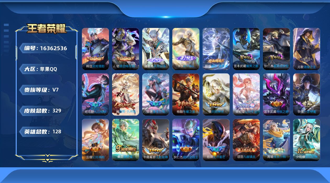 - [12027069]V8 1典藏 1无双 10传说 124英雄 225皮肤 可修改实名 优质装备:星域神启(倪克斯贼亮),碎月剑心(李白无双),炽阳神光,云霓雀翎,末日机甲-孙尚香(绿蚂蚱),音你心动-周瑜,无双飞将 珍宝阁皮:妄想食味 限定皮:愿照·岁时盈(虞姬年限),愿照·众生和(妲己年限),愿照·千秋盛(女娲年限),至尊宝,绯月行,飞衡(韩信年限),五谷丰年,梁祝,天狼狩猎者,天狼征服者,李小龙,辉光之辰,神器·万象笔,山海·玄木吟(马可年限) 史诗皮:化蝶舞,星界战将,怒海争锋,东方月初,海诺心动手记,琥珀纪元伽罗,百相守梦-百里守约,百相守梦-黄忠,紫霞仙子,电玩小子(小书包),黄金分割率,特工魅影,千年之狐,蒙恬荣光圣徽,无限星赏官,冰冠公主,青蛇,偶像歌手,晚萤,末日机甲-吕布,猫狗日记-孙策,乱世虎臣,节奏热浪,摇滚巨星,水果甜心,天才门将,星夜王子,心灵骇客,德古拉伯爵,暗隐猎兽者,鬼剑武藏,心灵战警,舞动绿茵,地狱岩魂,纤云弄巧,拒霜思,缤纷独角兽,乘风破浪,逐浪之夏,水晶猎龙者,曙光守护者,金属风暴,原初追逐者,圣诞狂欢,圣诞恋歌,鹰眼统帅,魅力维加斯,黎明之约,赏金猎手,无心,未来纪元-赵云