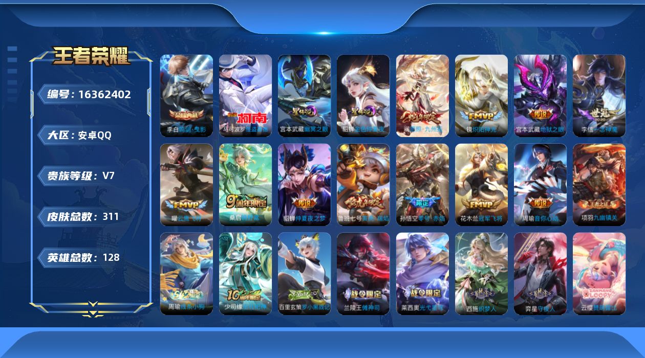 [16362402]可二次【店主推荐捡漏号!可直接换绑】安卓Q-V7-至尊星耀II段位-128英雄-311皮肤-1典藏皮肤-1珍品传说-3星传说-12传说-87史诗