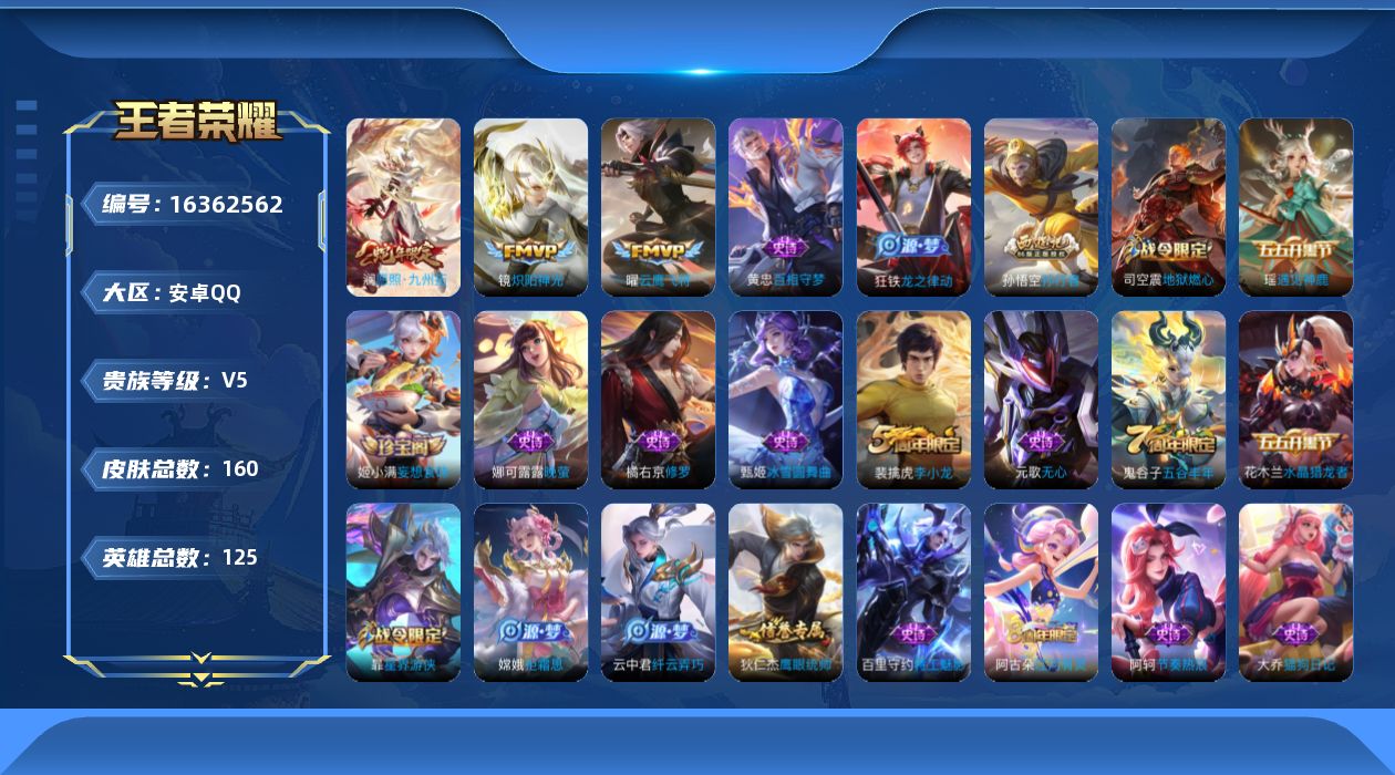 [16362562]可二次【特价出售/店主推荐】:安卓Q-V5-永恒钻石II段位-125英雄-160皮肤-3传说-38史诗