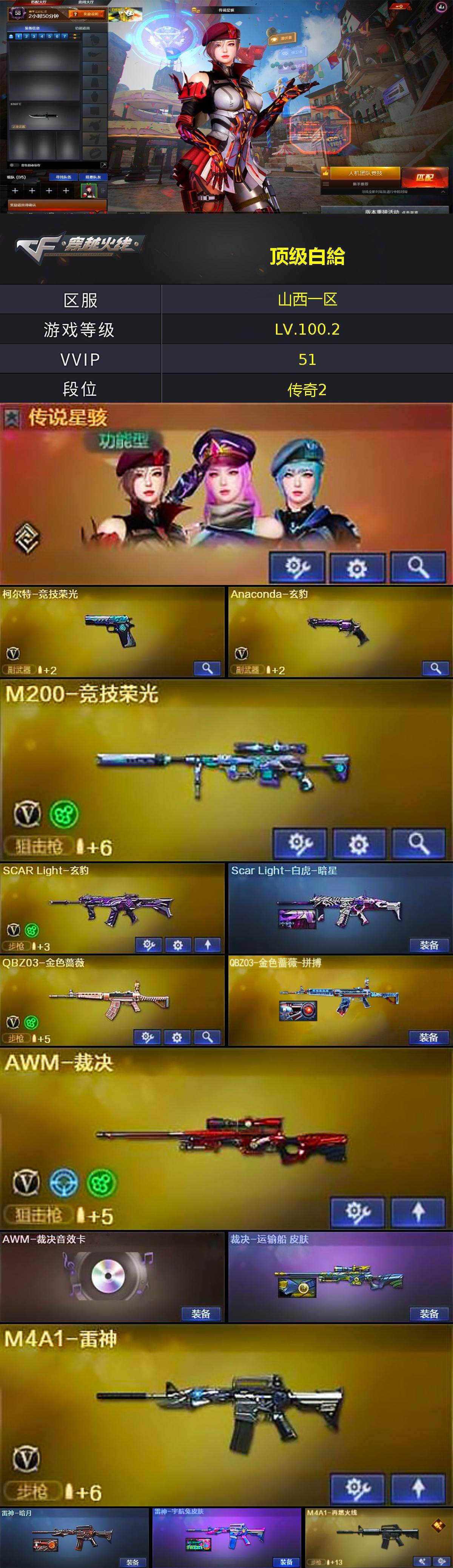 [16364709]山西一区-49V-2王者武器数-1炫金武器数 【传说角色】:传说星骇 【热门武器】:QBZ03-金色蔷薇,HK417-朱雀,M200-竞技荣光,加特林-炼狱 【王者炫金武器】:炫金毁灭 【音效卡】:AWM-裁决音效卡,麒麟刺-百战金芒-盛典舞曲音效卡,炼狱-百战金芒-庆典舞曲音效卡 【皮肤】:Scar Light-白虎-暗星,QBZ03-金色蔷薇-拼搏,裁决-运输船 皮肤,雷神-暗月,雷神-宇航兔皮肤,M4A1-再燃火线,毁灭-星空,毁灭-秦师 皮肤,毁灭-英雄计划 皮肤,无影-能量核心,轻型军用手斧-再燃火线 【角色】:玄豹,荆棘,战地猎狐,奇洋探员,乔伊教练,修道士,云海玲珑,暗夜-X,初恋灵狐,飞虎队-X,风暴女,嘉年华灵狐,娟娟,兰妹妹,灵狐者-X,龙儿-小淘气,麻雀,曼陀罗-X,潘多拉-X,青霞仙子,斯沃特-X,兔囡囡,樱-战斗天使,游珑儿 【人偶武器】:夺魂,生化手雷-机甲核心,灵狐娃娃手雷*2 【挑战大师】:冰龙粉碎者-白马银枪*2,激光毁灭者III-白马银枪,试炼破坏者III,KAC-圣炎切割者III,神圣爆裂者-末日III,惩戒者III 【英雄级武器】:AK47-火麒麟,M4A1-黑龙,M4A1-雷神,HK417-朱雀,黑武士-锦绣游龙,超新星-热带奇洋,SCAR Light-玄豹,QBZ03-独角-III,M4A1-玫瑰精灵,QBZ03-金色蔷薇,M4A1-猎神,AWM-天龙,Barrett-毁灭,AWM-裁决,M200-竞技荣光,Barrett-金色蔷薇,加特林-炼狱,炼狱-百战金芒,沙鹰-天神,柯尔特-竞技荣光,Anaconda-玄豹,龙啸,擎天-竞技荣光,龙啸-热带奇洋,麒麟刺-百战金芒,丛林匕首-玄豹,王者冰锋-觉醒版,高爆手雷-竞技荣光*2,手雷-热带奇洋,高爆手雷-玄豹*2,闪光弹-竞技荣光*4,闪光弹-玄豹*2,烟雾弹-竞技荣光*2,烟雾弹-玄豹*3,M4A1-赤狱骑士,M4A1-苍鸣雷神,Barrett-碧霄极光 【道具】:BS战队炫彩背包,CFS限定背包,云山科技背包,奇洋探员-海龟背包,战舰背包,热带奇洋炫彩背包,百战金芒炫彩背包,女皇终结者-魔龙之吻,救世主-黑桃战神,绿色巨人,灵魂忍者*2,变异宝贝,迷雾幽灵*2,夺命之镰,防化服*3,金色流光-枪王排位*2,星辰流光-枪王排位,流光-鎏金之域,枪王排位28赛季金色流光,