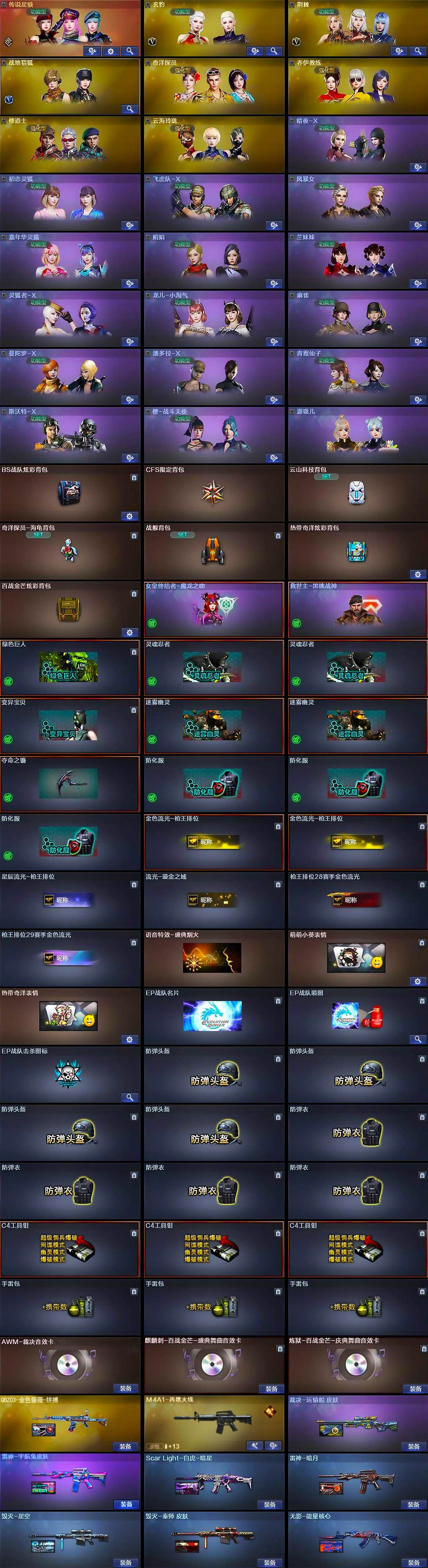 【道具】:BS战队炫彩背包,CFS限定背包,云山科技背包,奇洋探员-海龟背包,战舰背包,热带奇洋炫彩背包,百战金芒炫彩背包,女皇终结者-魔龙之吻,救世主-黑桃战神,绿色巨人,灵魂忍者*2,变异宝贝,迷雾幽灵*2,夺命之镰,防化服*3,金色流光-枪王排位*2,星辰流光-枪王排位,流光-鎏金之域,枪王排位28赛季金色流光,