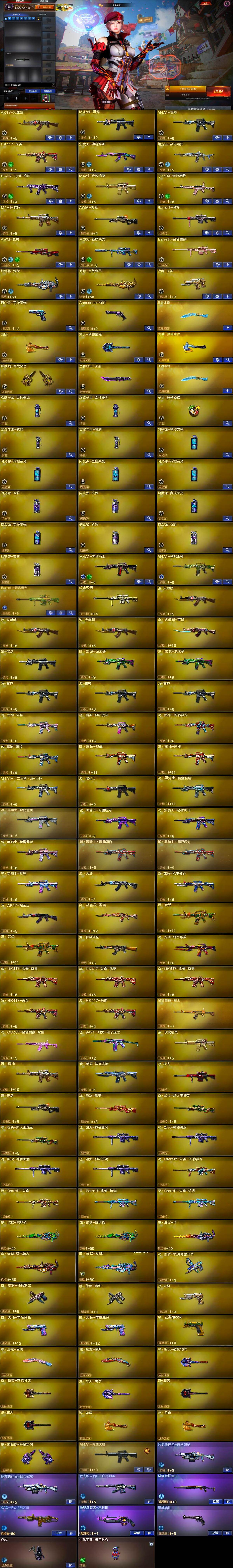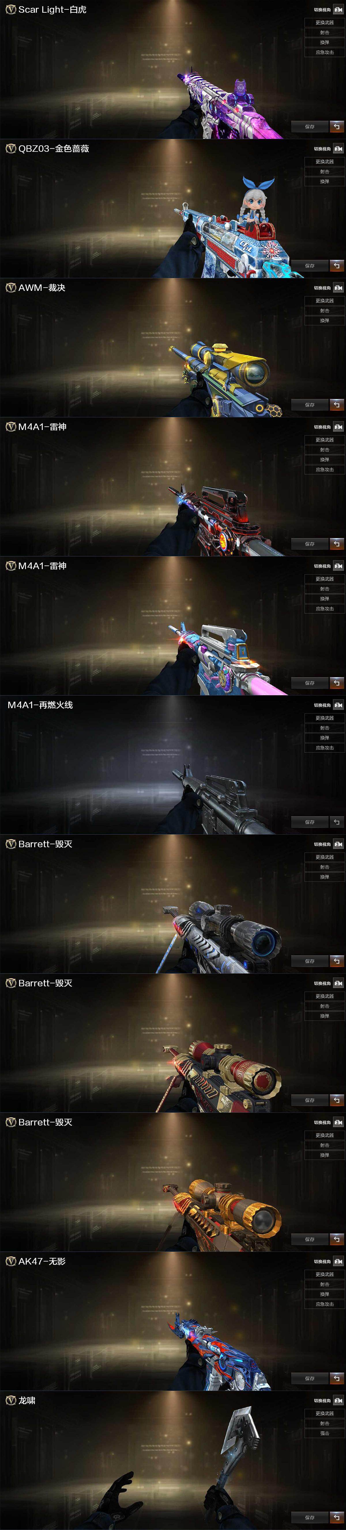 【英雄级武器】:AK47-火麒麟,M4A1-黑龙,M4A1-雷神,HK417-朱雀,黑武士-锦绣游龙,超新星-热带奇洋,SCAR Light-玄豹,QBZ03-独角-III,M4A1-玫瑰精灵,QBZ03-金色蔷薇,M4A1-猎神,AWM-天龙,Barrett-毁灭,AWM-裁决,M200-竞技荣光,Barrett-金色蔷薇,加特林-炼狱,炼狱-百战金芒,沙鹰-天神,柯尔特-竞技荣光,Anaconda-玄豹,龙啸,擎天-竞技荣光,龙啸-热带奇洋,麒麟刺-百战金芒,丛林匕首-玄豹,王者冰锋-觉醒版,高爆手雷-竞技荣光*2,手雷-热带奇洋,高爆手雷-玄豹*2,闪光弹-竞技荣光*4,闪光弹-玄豹*2,烟雾弹-竞技荣光*2,烟雾弹-玄豹*3,M4A1-赤狱骑士,M4A1-苍鸣雷神,Barrett-碧霄极光