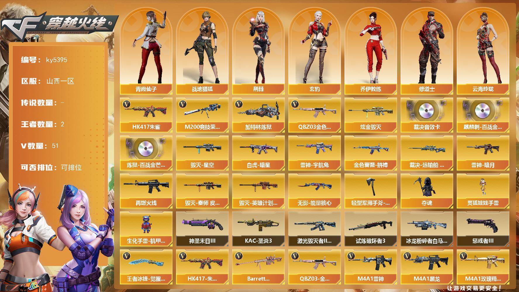 - [15248139]河南一区-51V-3王者-0炫金 【热门武器】:QBZ03-金色蔷薇,M200-幻神,金色蔷薇-古蛇迷踪,修罗-古蛇迷踪,C.A.T,M4A1-黑骑士,沙鹰-修罗*4 【王者炫金武器】:王者之锋 【音效卡】:M200-幻神音效卡,M4A1-黑骑士音效卡*2,Barrett-毁灭音效卡,Barrett-碧霄极光音效卡,白虎-盛典舞曲音效卡,炼狱-百战金芒-庆典舞曲音效卡 【皮肤】:幻神-青鹤,裁决-羽掣 皮肤,雷神-暗月,雷神-星空,雷神-源计划2.0专属 皮肤,雷神-诺拉 皮肤,M4A1-再燃火线,火麒麟-心动糖果,毁灭-虹光风暴 皮肤,毁灭-梦蝶 皮肤,毁灭-英雄计划 皮肤,黑龙-能量核心,黑骑士-暗月,天启-暗月,战神-粉色甜心皮肤*2,战神-紫绶金章皮肤*3,战神-流金岁月皮肤*3,AWM-天龙-传奇70KG,轻型军用手斧-再燃火线 【角色】:樱,电竞教官-云悠悠,荆棘,战地猎狐,蛇隐宗,奇洋探员,乔伊教练,修道士,云海玲珑,空,暗夜-X,初恋灵狐,芳心审判者,风暴女,嘉年华灵狐,疾风,灵动武士,零-水下丽影,灵狐者-X,灵狐者-黄金海岸,龙儿-小淘气,潘多拉-X,潘多拉-甜心教官,蛇姬,斯沃特-X,铁骑荣耀,兔囡囡,维纳斯,影武者-X,智影 【人偶武器】:AWM-灵狐-15周年嘉年华,C.A.T,迷你深渊冰龙,迷你裂空之翼,迷你生化手雷,迷你艾比 【暴走生化】:超级对讲机 【挑战大师】:冰龙粉碎者-白马银枪,激光毁灭者III-白马银枪,神圣爆裂者-末日III 【英雄级武器】:AK47-火麒麟,M4A1-黑龙,M4A1-雷神*2,M4A1-黑骑士,M4A1-死神,AK12-天启,AN94-超新星,AK47-黑鲨,无影-神兵利器,黑武士-锦绣游龙,金色蔷薇-古蛇迷踪,QBZ03-金色蔷薇,AK-47-猩红传说*5,AK47-B-战神,AWM-天龙,Barrett-毁灭*2,Barrett-极光,AWM-裁决,M200-幻神,炼狱-百战金芒,沙鹰-修罗*4,修罗-古蛇迷踪,屠龙,龙啸,擎天,麒麟刺,龙啸-热带奇洋,麒麟刺-百战金芒,王者之锋-觉醒版,高爆手雷-雷霆,手雷-动感闪耀,手雷-热带奇洋,高爆手雷-古蛇迷踪,闪光弹-雷霆,闪光弹-竞技荣光,烟雾弹-雷霆,烟雾弹-古蛇迷踪,M4A1-赤狱骑士,Barrett-碧霄极光 【道具】:BS战队炫彩背包,CFS限定