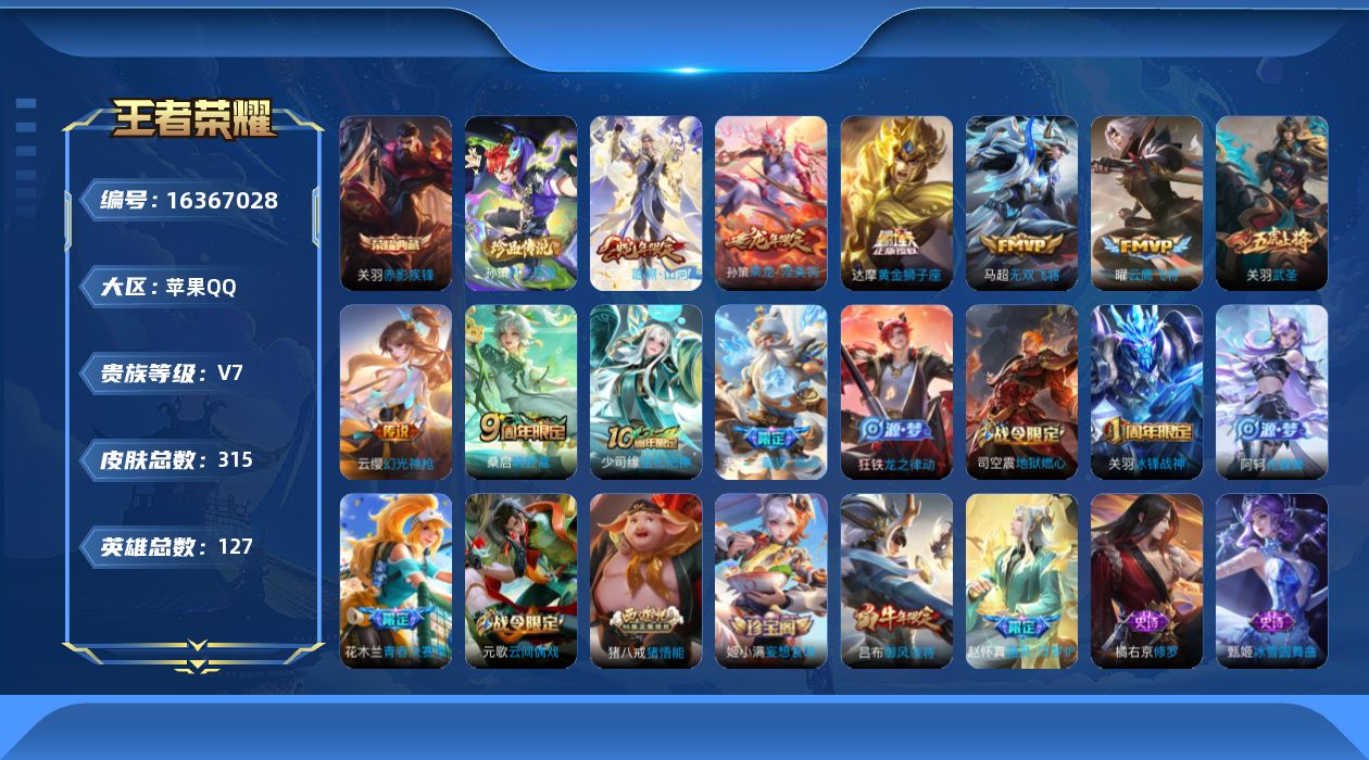 - [11609245]V7 1典藏 10传说 124英雄 274皮肤 可修改实名 优质装备:九霄神辉(木兰典藏),黄金狮子座,冠军飞将,云鹰飞将(小将军),炽阳神光,末日机甲-孙尚香(绿蚂蚱),浮生妄 传说皮:幻光神枪 珍宝阁皮:妄想食味,蔷薇恋人,女武神 限定皮:愿照·山河定(司空震年限),鸣野蒿,至尊宝,凤求凰(白切鸡),傲雪梅枪,神威(电光马子),飞衡(韩信年限),五谷丰年,梁祝,御风骁将(吕布年限),李小龙,逐梦之影,时之祈愿-云中君,山海·玄木吟(马可年限) 史诗皮:器灵·浮梦炉,化蝶舞,星界战将,龙之律动,百相守梦-黄忠,紫霞仙子,苍穹之光,电玩小子(小书包),白龙吟,黄金分割率,特工魅影,千年之狐,电玩·爆裂旋风,蒙恬荣光圣徽,龙骑士(小龙虾),暗夜猫娘,冰冠公主,猫狗日记-孙策,猫狗日记-大乔,乱世虎臣,节奏热浪,女仆咖啡,水果甜心,绅士熊喵,天才门将,星夜王子,心灵骇客,功夫厨神,德古拉伯爵,暗隐猎兽者,幽灵船长,鬼剑武藏,心灵战警,地狱岩魂,纤云弄巧,繁星吟游(呼啦呼啦),缤纷独角兽,乘风破浪,逐浪之夏,水晶猎龙者,热力回旋,箭羽风息,金属风暴,原初追逐者,圣诞恋歌,鹰眼统帅,黎明之约,赏金猎手,无心,未来纪元-赵云