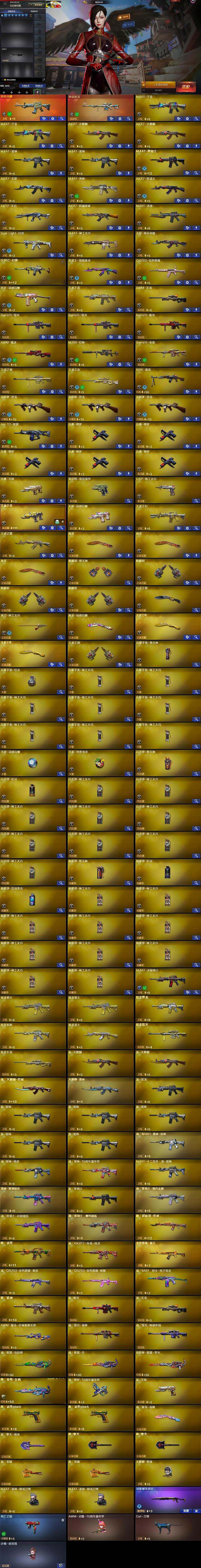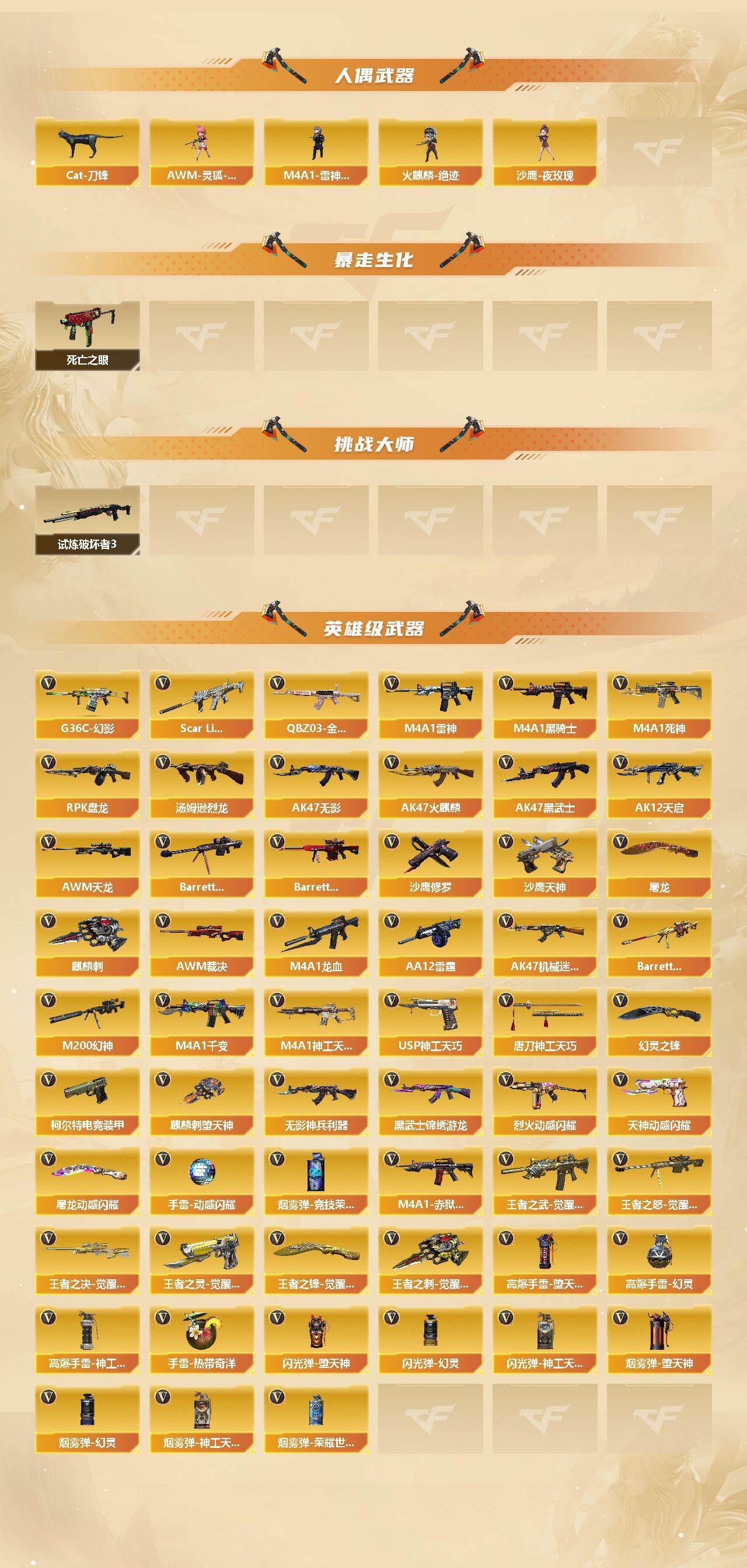 【英雄级武器】:M4A1-千变*2,AK47-火麒麟*2,M4A1-雷神*2,M4A1-黑骑士,AK47-无影,M4A1-死神,AK47-黑武士,AK12-天启,AK47-机械迷城,M4A1-龙血,Scar Light-白虎,M4A1-神工天巧,无影-神兵利器,G36C-幻影,黑武士-锦绣游龙,QBZ03-金色蔷薇,烈火-动感闪耀,王者之武-觉醒版,AWM-天龙,Barrett-毁灭*2,Barrett-极光,AWM-裁决,M200-幻神,Barrett-朱雀,王者之怒-觉醒版,王者之决-觉醒版,RPK-盘龙,