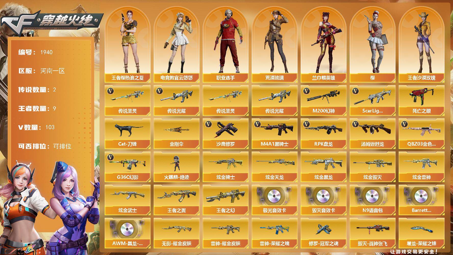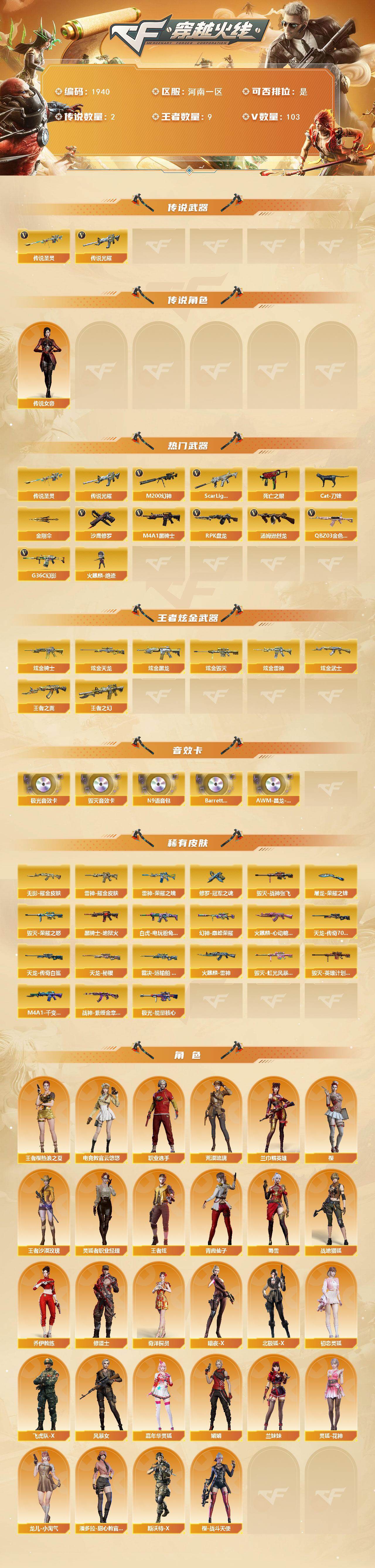 [16368203]河南一区-112V-9王者武器数-7炫金武器数 【传说武器】:传说光耀,传说圣灵 【传说角色】:传说女帝 【热门武器】:传说光耀,传说圣灵,G36C-幻影,QBZ03-金色蔷薇,Scar Light-白虎,M200-幻神,死亡之眼,Cat-刀锋,M4A1-黑骑士,汤姆逊-烈龙*3,RPK-盘龙,火麒麟-绝迹,沙鹰-修罗*5,金刚伞 【王者炫金武器】:王者之幻,王者之翼,炫金骑士*2,炫金黑龙,炫金雷神,炫金武士,炫金毁灭,炫金天龙 【音效卡】:Barrett-毁灭音效卡*2,Barrett-极光音效卡,N9语音包,Barrett-碧霄极光音效卡,AWM-昌龙-怀旧音效卡 【皮肤】:幻神-巅峰荣耀,白虎-电玩粉兔皮肤,裁决-运输船 皮肤,雷神-荣耀之魄,雷神-耀金皮肤,火麒麟-雷神,火麒麟-心动糖果,毁灭-荣耀之怒*2,毁灭-战神张飞,毁灭-虹光风暴 皮肤,毁灭-英雄计划 皮肤,M4A1-千变-孔明皮肤,黑骑士-地狱火,无影耀金皮肤*3,战神-紫绶金章皮肤,天龙-秘银,AWM-天龙-传奇70KG,AWM-天龙-传奇白鲨*3,极光-能量核心,修罗-冠军之魂,屠龙-荣耀之锋 【角色】:樱,电竞教官-云悠悠,荒漠琉璃,兰-巾帼英雄,战地猎狐,王者樱-热浪之夏,王者炫,王者沙漠玫瑰,奇洋探员,乔伊教练,修道士,暗夜-X,北极狐-X,初恋灵狐,飞虎队-X,风暴女,嘉年华灵狐,娟娟,兰妹妹,灵狐-花神,灵狐者-职业经理,龙儿-小淘气,潘多拉-甜心教官,青霞仙子,斯沃特-X,蜀雪,樱-战斗天使,职业选手 【人偶武器】:火麒麟-绝迹,M4A1-雷神-精英刀锋*2,AWM-灵狐-15周年嘉年华,Cat-刀锋,沙鹰-夜玫瑰 【暴走生化】:死亡之眼 【挑战大师】:试炼破坏者III 【英雄级武器】:M4A1-千变*2,AK47-火麒麟*2,M4A1-雷神*2,M4A1-黑骑士,AK47-无影,M4A1-死神,AK47-黑武士,AK12-天启,AK47-机械迷城,M4A1-龙血,Scar Light-白虎,M4A1-神工天巧,无影-神兵利器,G36C-幻影,黑武士-锦绣游龙,QBZ03-金色蔷薇,烈火-动感闪耀,王者之武-觉醒版,AWM-天龙,Barrett-毁灭*2,Barrett-极光,AWM-裁决,M200-幻神,Barrett-朱雀,王者之怒-觉醒版,王者之决-觉醒版,RPK-盘龙,