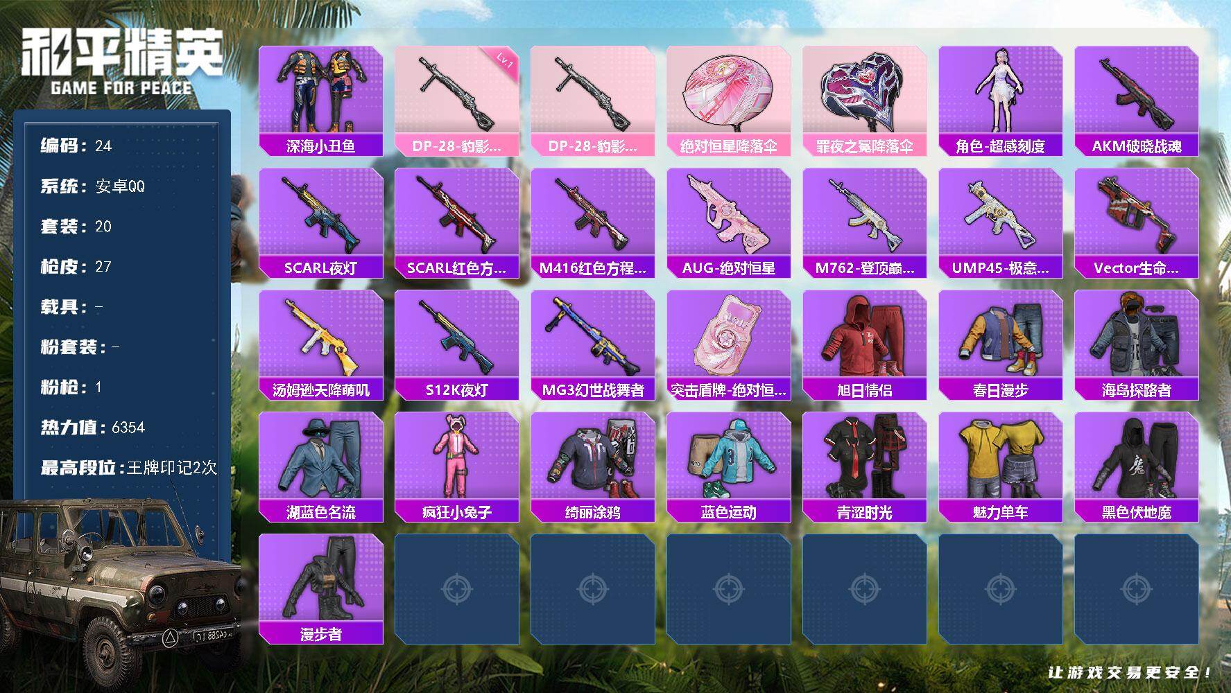 [16368827]安卓 手Q-0粉装-1特效枪-0载具-1粉色飞行器-6354热力值-2王牌印记-20套装-27枪皮