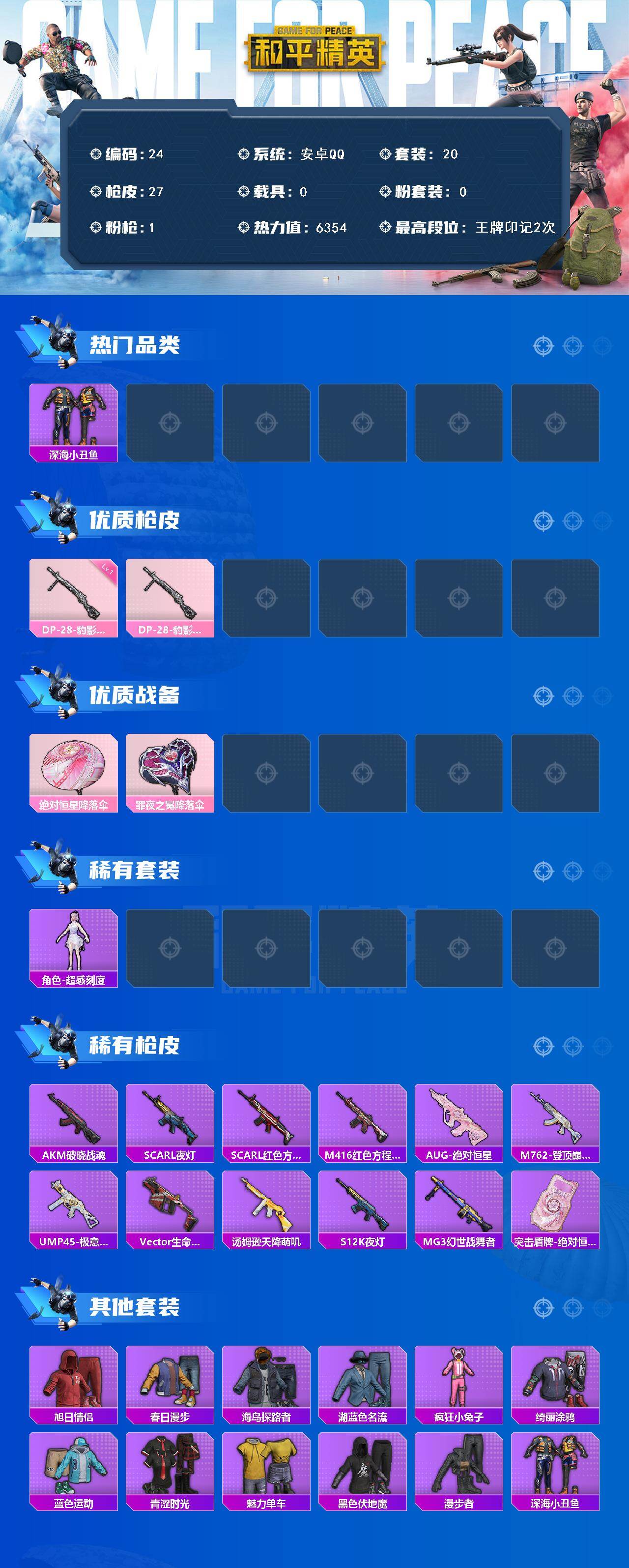 [16368827]安卓 手Q-0粉装-1特效枪-0载具-1粉色飞行器-6354热力值-2王牌印记-20套装-27枪皮 【热门品类】:套装-深海小丑鱼 【粉色枪皮等级】:DP-28-豹影疾电(一级) 【粉色枪皮】:DP-28-豹影疾电 【粉色降落伞】:绝对恒星降落伞,炫彩糖果降落伞,罪夜之冕降落伞 【稀有套装】:角色-超感刻度,套装-雪国风尚,套装-炫彩糖果 【稀有枪皮】:AUG-冰晶雪宝,AKM-破晓战魂,SCAR-L-夜灯,SCAR-L-红色方程式,M416-红色方程式,AUG-绝对恒星,M762-登顶巅峰,UMP45-极意拳锋,Vector-生命誓言,汤姆逊-天降萌叽,S12K-夜灯,MG3-幻世战舞者,突击盾牌-绝对恒星 【其他套装】:套装-旭日情侣,套装-春日漫步,套装-海岛探路者,套装-湖蓝色名流,套装-疯狂小兔子,套装-绮丽涂鸦,套装-蓝色运动,套装-青涩时光,套装-魅力单车,套装-黑色伏地魔,套装-漫步者,套装-深海小丑鱼 【营地ID】:1032003764