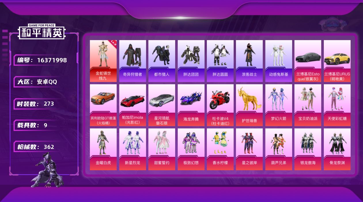 [16371998]安卓 手Q-无敌战神框-1神装-24粉装-22特效枪-9载具-7粉色飞行器-141228热力值-22王牌印记-273套装-362枪皮