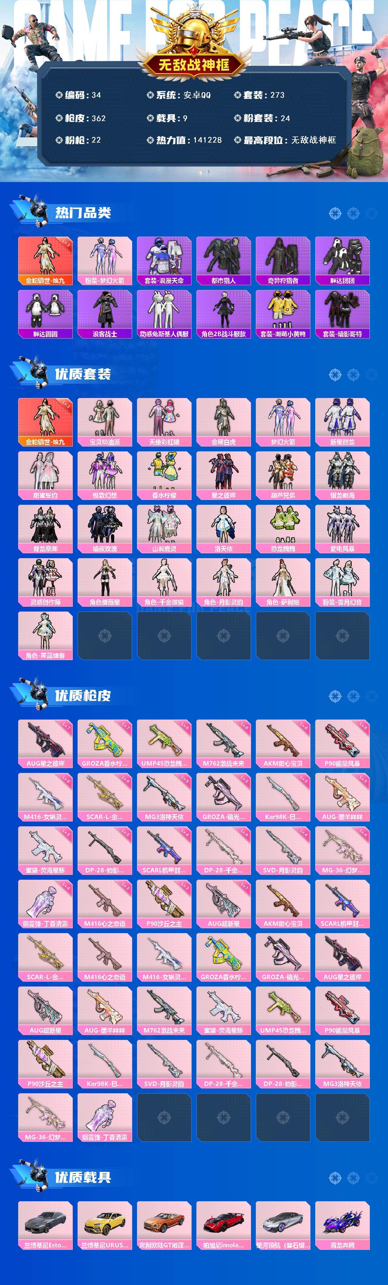 [16371998]安卓 手Q-无敌战神框-1神装-24粉装-22特效枪-9载具-7粉色飞行器-141228热力值-22王牌印记-273套装-362枪皮 【红色神装等级】:金蛇镇世-烛九(三级) 【红色角色神装】:金蛇镇世-烛九 【热门品类】:粉装-梦幻火箭,套装-浪漫天命,套装-都市猎人,套装-奇异狩猎者,套装-胖达团团,套装-胖达圆圆,套装-浪客战士,套装-动感兔斯基人偶服,角色-2B战斗服款,套装-潮萌小黄鸭,套装-暗影哥特 【粉色套装】:粉装-宝贝奶油派,粉装-天使彩虹糖,粉装-金曜白虎,粉装-梦幻火箭,粉装-新星烈龙,粉装-甜蜜誓约,粉装-极致幻想,粉装-香水柠檬,粉装-星之彼岸,粉装-葫芦兄弟,粉装-银龙傲海,粉装-骨龙祭渊,粉装-暗夜玫瑰,粉装-山涧鹿灵,角色-洛天依,粉装-恐龙拽拽,粉装-紫电风暴,粉装-灵感创作师,角色-蔷薇星,角色-千金淑猫,角色-月影灵韵,角色-萨利娅,粉装-雪月幻音,角色-霁蓝缠春 【粉色枪皮等级】:AKM-甜心宝贝(六级),SCAR-L-机甲封神(四级),SCAR-L-金蛇镇世(六级),M416-心之恋语(三级),M416-女娲灵识(六级),GROZA-香水柠檬(七级),GROZA-镜光银凌(五级),AUG-星之彼岸(七级),AUG-超新星(一级),AUG-暖羊咩咩(五级),M762-激战未来(六级),蜜獾-荧海星豚(五级),UMP45-恐龙拽拽(六级),P90-能量风暴(六级),P90-沙丘之主(三级),Kar98K-巳巳如意(五级),SVD-月影灵韵(四级),DP-28-千金淑猫(四级),DP-28-豹影疾电(五级),MG3-洛神天依(五级),MG-36-幻梦之森(四级),烟雾弹-丁香清露(四级) 【粉色载具】:兰博基尼Estoque(银翼灰),兰博基尼URUS(明艳黄),宾利欧陆GT敞篷(火焰橘),帕加尼imola(光影红),星河领航(磐石银),海龙奔腾,杜卡迪 Panigale V4(杜卡迪红),护世瑞兽,暮色幽蹄 【粉色枪皮】:AKM-甜心宝贝,SCAR-L-机甲封神,SCAR-L-金蛇镇世,M416-心之恋语,M416-女娲灵识,GROZA-香水柠檬,GROZA-镜光银凌,AUG-星之彼岸,AUG-超新星,AUG-暖羊咩咩,M762-激战未来,蜜獾-荧海星豚,UMP45-恐龙拽拽,P90-能量风暴,P90-沙丘之主,Kar98K-