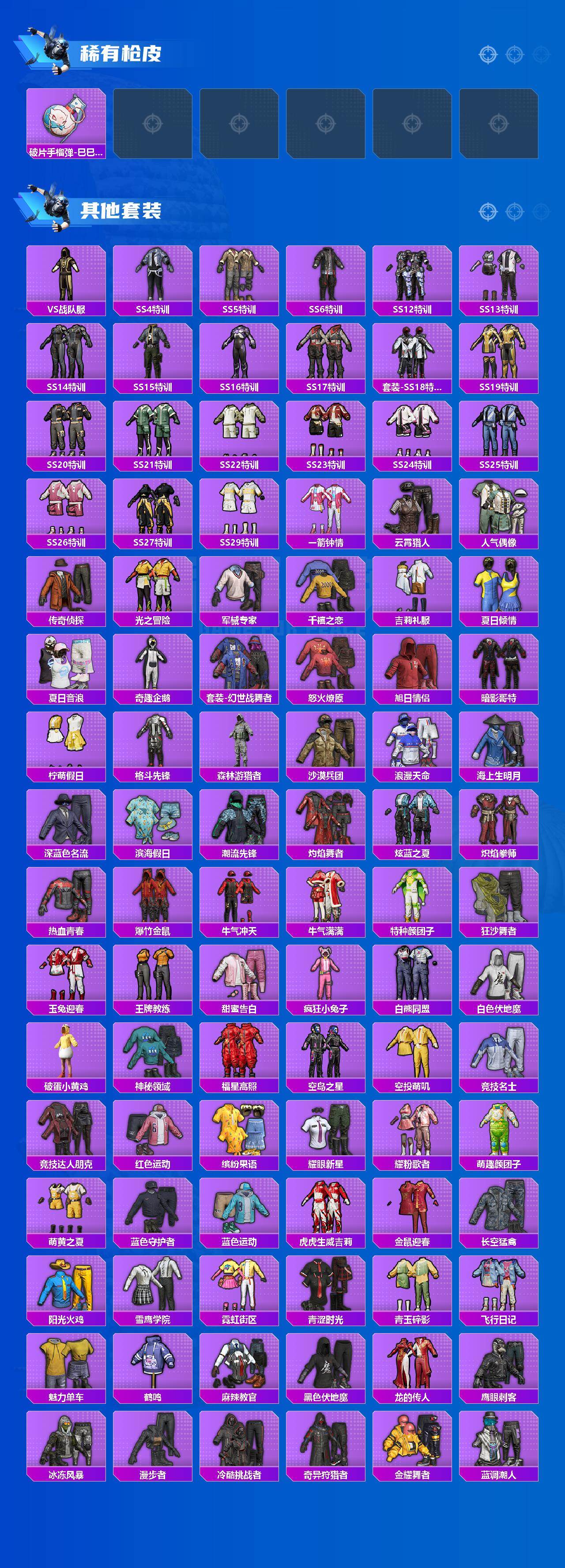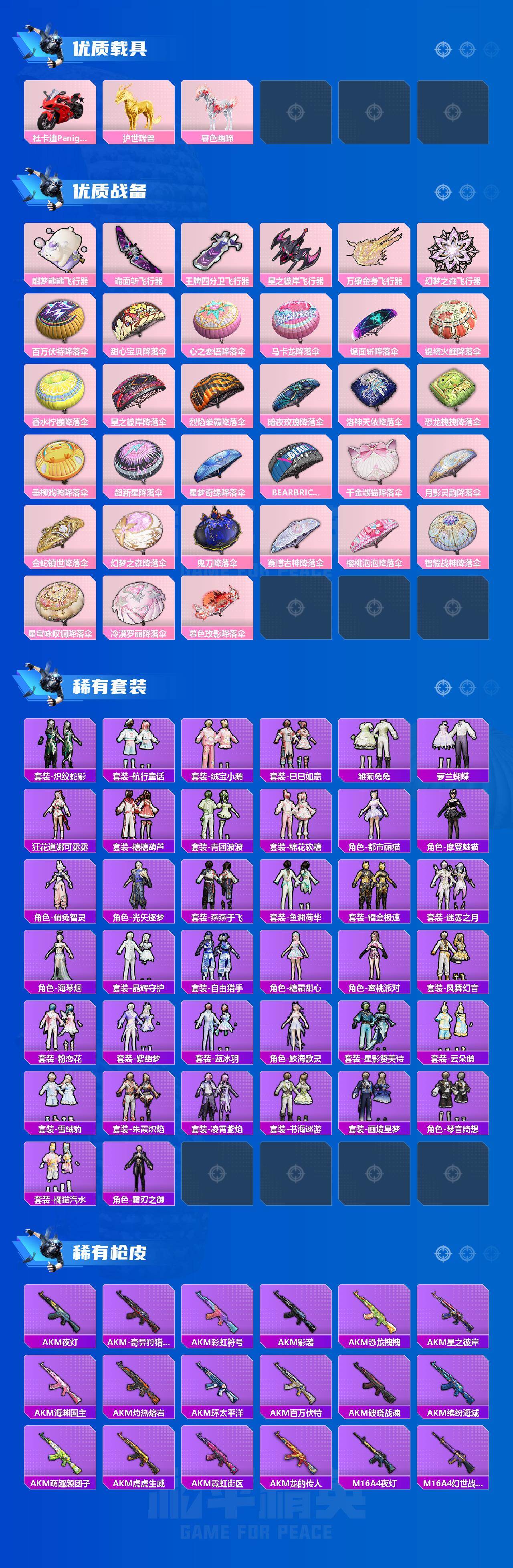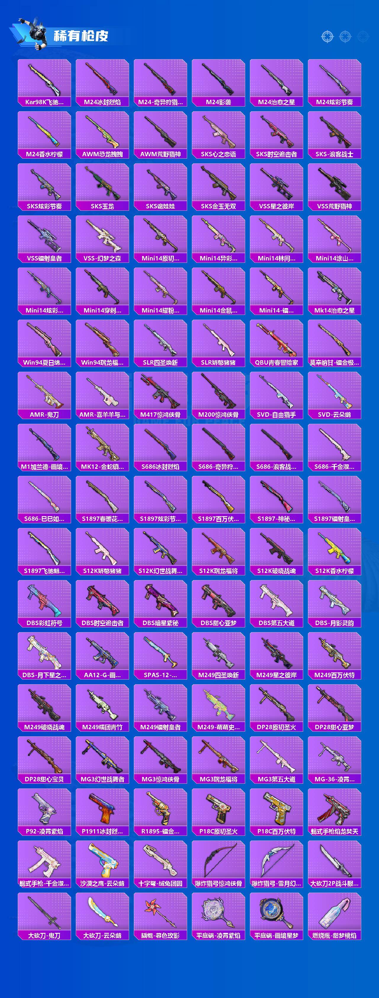 AKM-甜心宝贝,SCAR-L-机甲封神,SCAR-L-金蛇镇世,M416-心之恋语,M416-女娲灵识,GROZA-香水柠檬,GROZA-镜光银凌,AUG-星之彼岸,AUG-超新星,AUG-暖羊咩咩,M762-激战未来,UMP45-恐龙拽拽,P90-能量风暴,P90-沙丘之主,Kar98K-巳巳如意,SVD-月影灵韵,DP-28-千金淑猫,MG3-洛神天依,MG-36-幻梦之森,烟雾弹-丁香清露