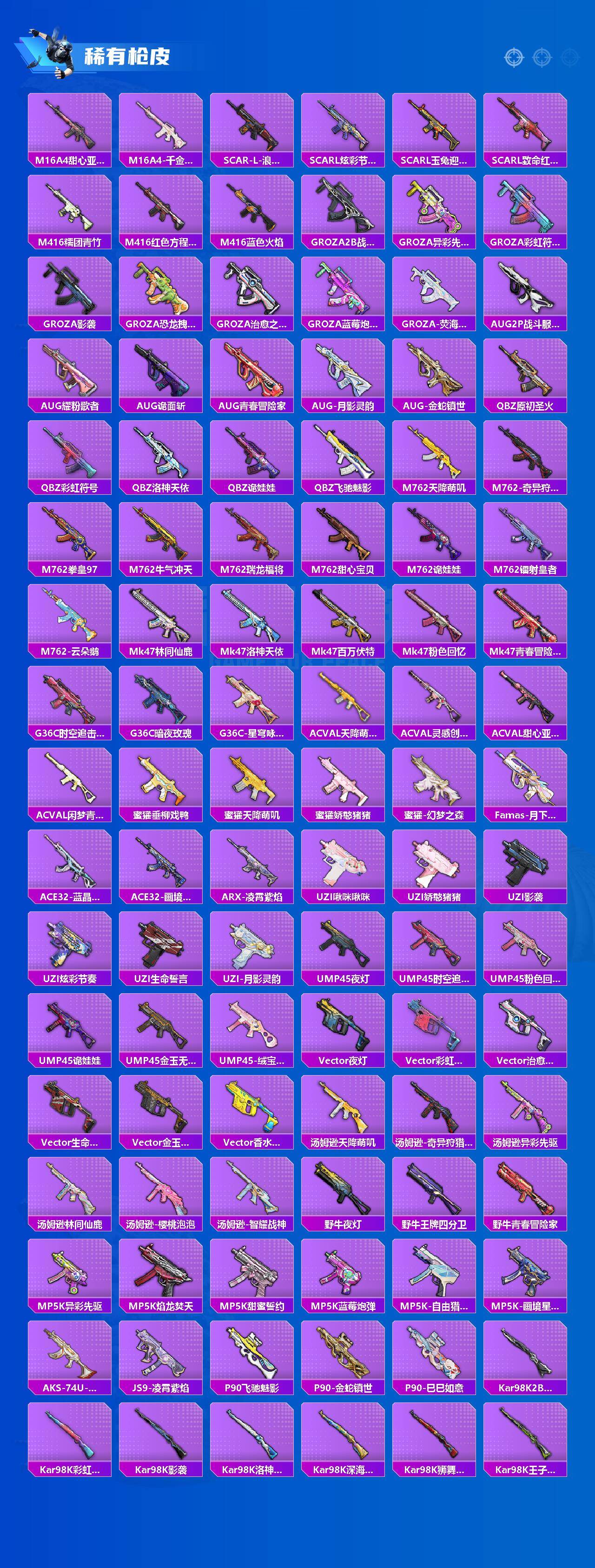 【粉色枪皮】:AKM-甜心宝贝,SCAR-L-机甲封神,SCAR-L-金蛇镇世,M416-心之恋语,M416-女娲灵识,GROZA-香水柠檬,GROZA-镜光银凌,AUG-星之彼岸,AUG-超新星,AUG-暖羊咩咩,M762-激战未来,蜜獾-荧海星豚,UMP45-恐龙拽拽,P90-能量风暴,P90-沙丘之主,Kar98K-
