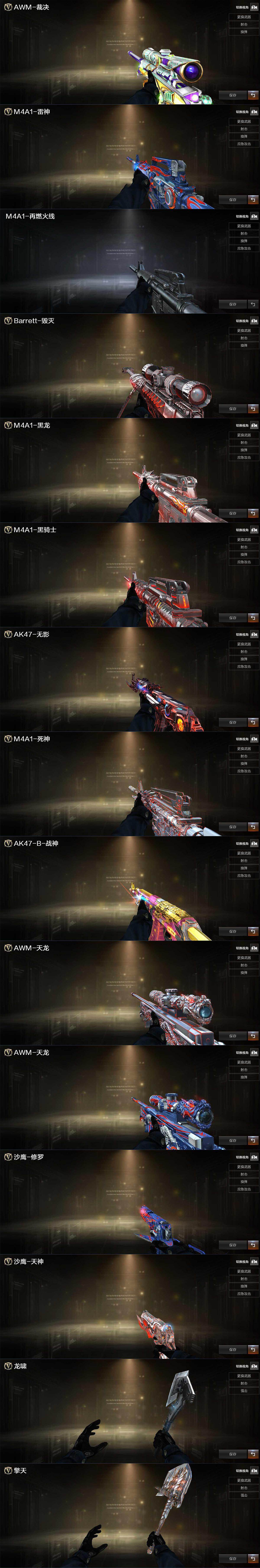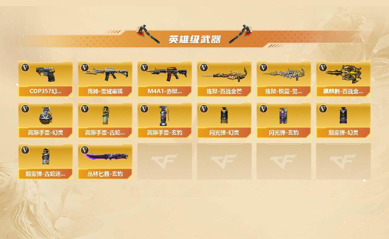 【英雄级武器】:AK47-火麒麟,M4A1-雷神,M4A1-黑骑士*3,AK47-黑武士,AK12-天启,AK47-机械迷城*3,M4A1-龙血,HK417-朱雀,金色蔷薇-古蛇迷踪,死神-雪域霜狐,M4A1-玫瑰精灵,AWM-天龙,Barrett-毁灭,AWM-裁决,M200-幻神,Kar98K-星神,Barrett-金色蔷薇,RPK-盘龙*6,炼狱-百战金芒,炼狱-悦蓝-觉醒版,汤姆逊-烈龙*5,沙鹰-修罗*3,沙鹰-天神*2,COP 357-幻灵,修罗-古蛇迷踪,屠龙,擎天*2,麒麟刺,麒麟刺-百战金芒,丛林匕首-玄豹*2,高爆手雷-幻灵,高爆手雷-古蛇迷踪,高爆手雷-玄豹,闪光弹-幻灵,闪光弹-玄豹*4,烟雾弹-幻灵,烟雾弹-古蛇迷踪,M4A1-赤狱骑士