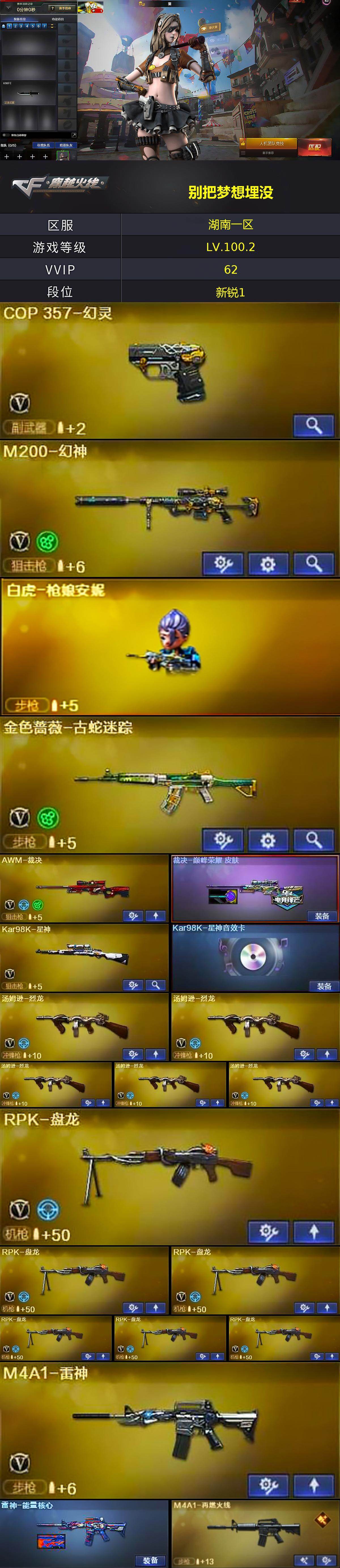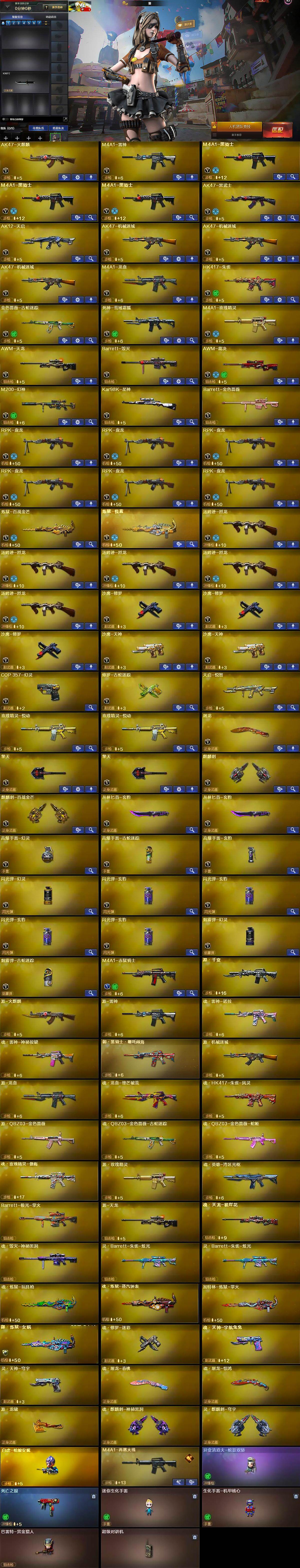 【热门武器】:HK417-朱雀,M200-幻神,金色蔷薇-古蛇迷踪,修罗-古蛇迷踪,死亡之眼,Kar98K-星神,M4A1-黑骑士*3,汤姆逊-烈龙*5,RPK-盘龙*6,羊驼玩偶,白虎-枪娘安妮,COP 357-幻灵,沙鹰-修罗*3
