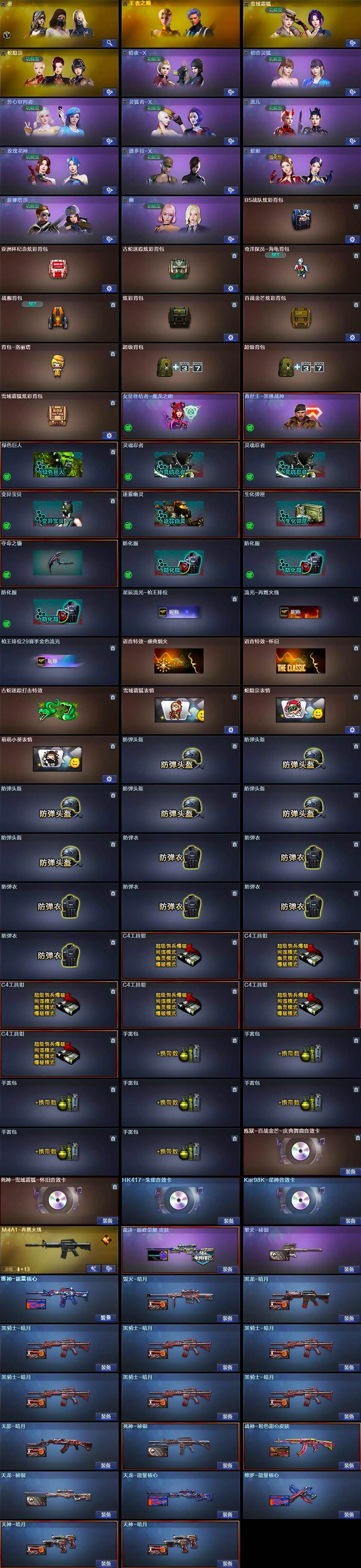 【道具】:BS战队炫彩背包,亚洲杯纪念炫彩背包,古蛇迷踪炫彩背包,奇洋探员-海龟背包,战舰背包,炫彩背包,百战金芒炫彩背包,背包-洛丽塔,超级背包*2,雪域霜狐炫彩背包,女皇终结者-魔龙之吻,救世主-黑桃战神,绿色巨人,灵魂忍者*2,变异宝贝,迷雾幽灵,生化弹匣,夺命之镰,防化服*3,星辰流光-枪王排位,流光-再燃火线,枪王排位29赛季金