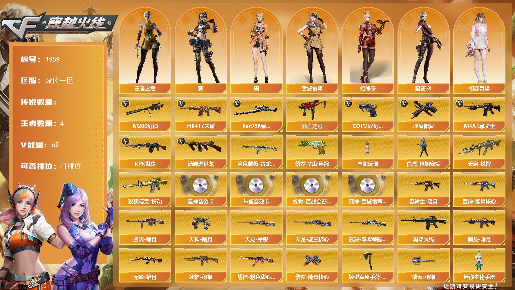 [16372247]湖南一区-59V-4王者武器数-0炫金武器数 【热门武器】:HK417-朱雀,M200-幻神,金色蔷薇-古蛇迷踪,修罗-古蛇迷踪,死亡之眼,Kar98K-星神,M4A1-黑骑士*3,汤姆逊-烈龙*5,RPK-盘龙*6,羊驼玩偶,白虎-枪娘安妮,COP 357-幻灵,沙鹰-修罗*3 【王者炫金武器】:天启-悦智,玫瑰精灵-悦动*2 【音效卡】:Kar98K-星神音效卡,HK417-朱雀音效卡,炼狱-百战金芒-庆典舞曲音效卡,死神-雪域霜狐-怀旧音效卡 【皮肤】:裁决-巅峰荣耀 皮肤,雷神-能量核心,M4A1-再燃火线,毁灭-暗月,黑龙-暗月,黑骑士-暗月*6,无影-暗月,死神-秘银,战神-粉色甜心皮肤,天龙-秘银,天龙-能量核心,修罗-能量核心,天神-暗月*2,轻型军用手斧-再燃火线,擎天-秘银 【角色】:葵,王者之瞳,雪域霜狐,蛇隐宗,暗夜-X,初恋灵狐,芳心审判者,灵狐者-X,龙儿,玫瑰花神,潘多拉-X,蛇姬,兔囡囡,新娜塔莎,幽 【人偶武器】:白虎-枪娘安妮,异变清道夫-蛇影双骄,迷你生化手雷,生化手雷-机甲核心,巴雷特-赏金猎人 【暴走生化】:死亡之眼,超级对讲机 【英雄级武器】:AK47-火麒麟,M4A1-雷神,M4A1-黑骑士*3,AK47-黑武士,AK12-天启,AK47-机械迷城*3,M4A1-龙血,HK417-朱雀,金色蔷薇-古蛇迷踪,死神-雪域霜狐,M4A1-玫瑰精灵,AWM-天龙,Barrett-毁灭,AWM-裁决,M200-幻神,Kar98K-星神,Barrett-金色蔷薇,RPK-盘龙*6,炼狱-百战金芒,炼狱-悦蓝-觉醒版,汤姆逊-烈龙*5,沙鹰-修罗*3,沙鹰-天神*2,COP 357-幻灵,修罗-古蛇迷踪,屠龙,擎天*2,麒麟刺,麒麟刺-百战金芒,丛林匕首-玄豹*2,高爆手雷-幻灵,高爆手雷-古蛇迷踪,高爆手雷-玄豹,闪光弹-幻灵,闪光弹-玄豹*4,烟雾弹-幻灵,烟雾弹-古蛇迷踪,M4A1-赤狱骑士 【道具】:BS战队炫彩背包,亚洲杯纪念炫彩背包,古蛇迷踪炫彩背包,奇洋探员-海龟背包,战舰背包,炫彩背包,百战金芒炫彩背包,背包-洛丽塔,超级背包*2,雪域霜狐炫彩背包,女皇终结者-魔龙之吻,救世主-黑桃战神,绿色巨人,灵魂忍者*2,变异宝贝,迷雾幽灵,生化弹匣,夺命之镰,防化服*3,星辰流光-枪王排位,流光-再燃火线,枪王排位29赛季金